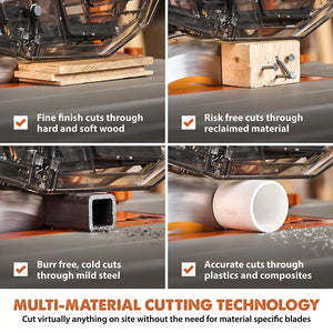 POWERFUL The powerful 15A motor is fine tuned to deliver maximum torque to rip through the toughest materials with ease, while the premium 10” multi-material tungsten carbide tipped (TCT) blade ensures the perfect cut through almost any material you’re working with. The motor features soft start technology to prevent power trips on start-up and an electronic blade brake that stop the blade in seconds. Meanwhile the overload protection actively monitors the motor to optimize performance and prolong tool life.