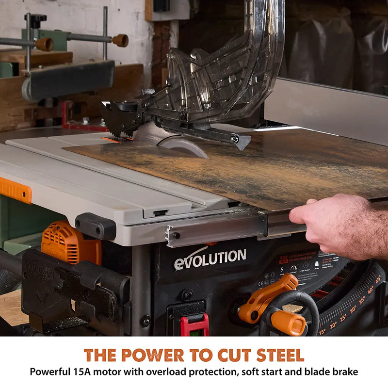 Evolution R10TBLX Multi-Material Table Saw with Wheeled Scissor Stand | 10 in. Multi-Material Cutting Blade