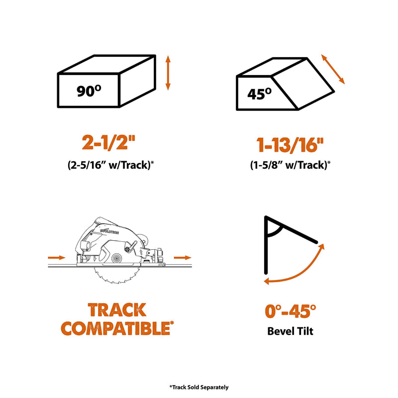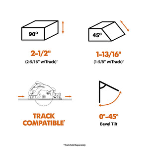 | Max Cut Depth Bevel 0° | 2-1/2” (2-5/16” w/Track) |