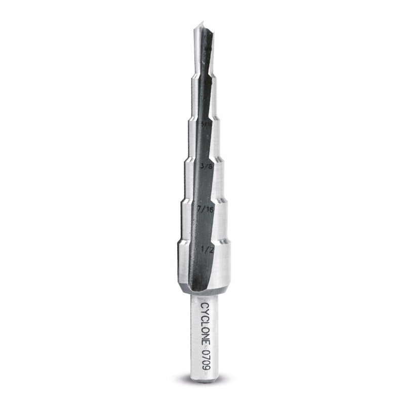 Evolution Premium Step Drills are used to produce a range of hole sizes in steel up to 1/8" thick using only one tool. The twin flute design allows for a smoother cutting action with no pre-drilling necessary. Evolution Premium Step Drills have 3 chucking flats on the driving shank to ensure no slipping in the chuck.