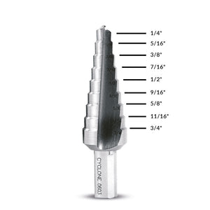 Evolution Premium Step Drills are used to produce a range of hole sizes in steel up to 1/8" thick using only one tool. The twin flute design allows for a smoother cutting action with no pre-drilling necessary. Evolution Premium Step Drills have 3 chucking flats on the driving shank to ensure no slipping in the chuck.