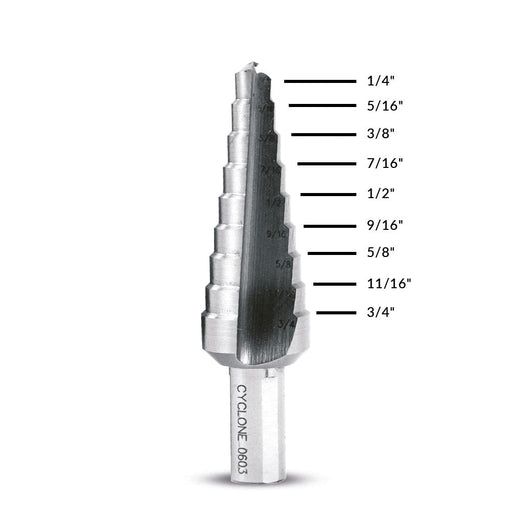 Evolution SD-9: 1/4 to 3/4 in. Straight Flute Step Drill$39.00$39.00SD-9: (9 Hole Sizes) Two Flutes 3/8" Shank1/4", 5/16", 3/8", 7/16", 1/2", 9/16", 5/8", 11/16", 3/4" Evolution Premium Step Drills are made from th...