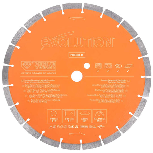 Evolution D300SEG-CS2 | 12 in. | Segmented Edge | 1 in. Arbor | Concrete, Stone, Brick Cutting Diamond Blade$89.00$89.00High-performance diamond blade with the ability to cut all types of masonry including reinforced concrete with steel rebar. Compatible with the R... Blade Size 12 In. Bore 1 In. Kerf 0.091 in.