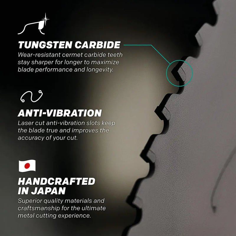 - Tungsten Carbide: 100 superior quality Japanese tungsten carbide teeth with anti-vibration slots provide a cleaner, more accurate cut.