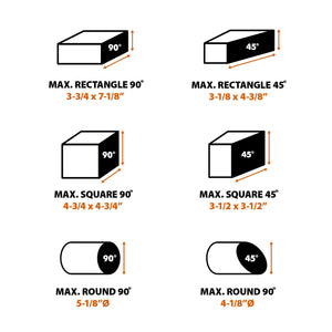 | Max. Square Tube Cut (0° x 45°) | 3-1/2" x 3-1/2" |