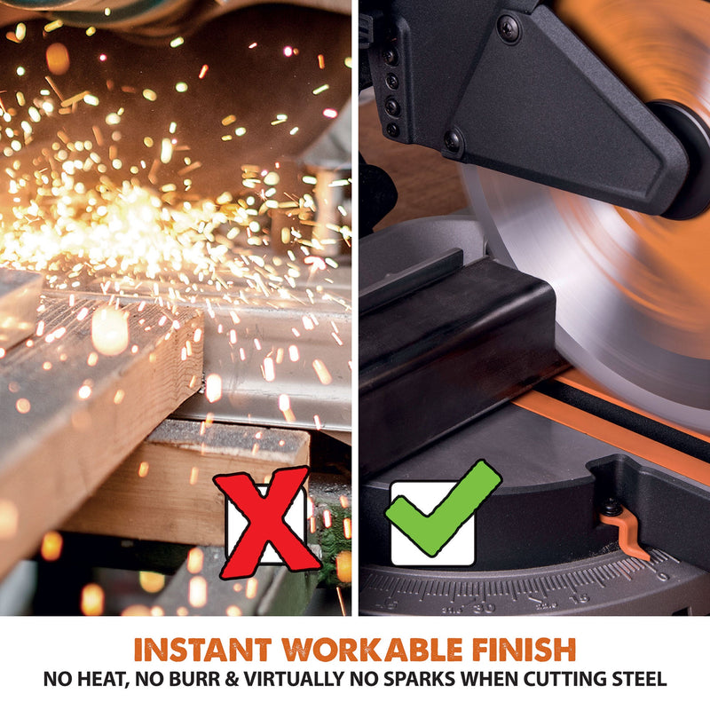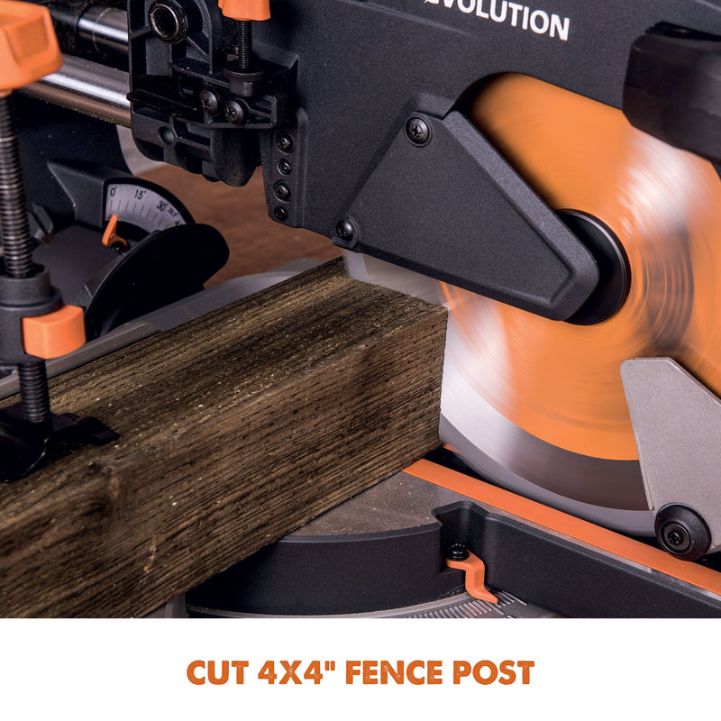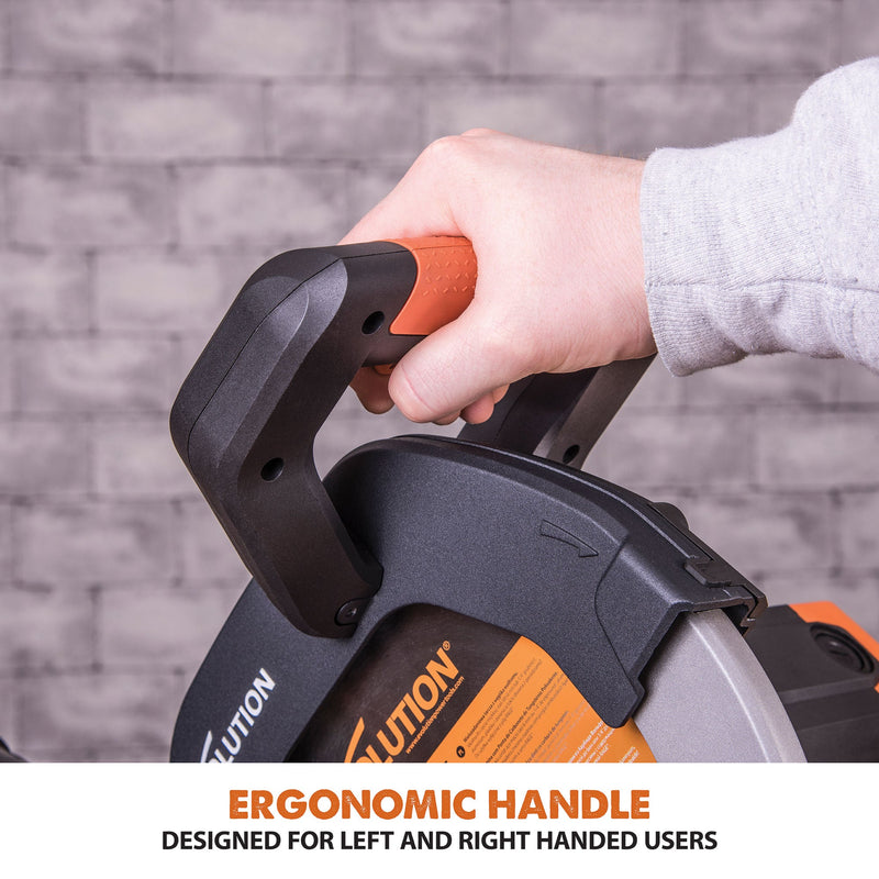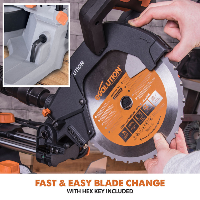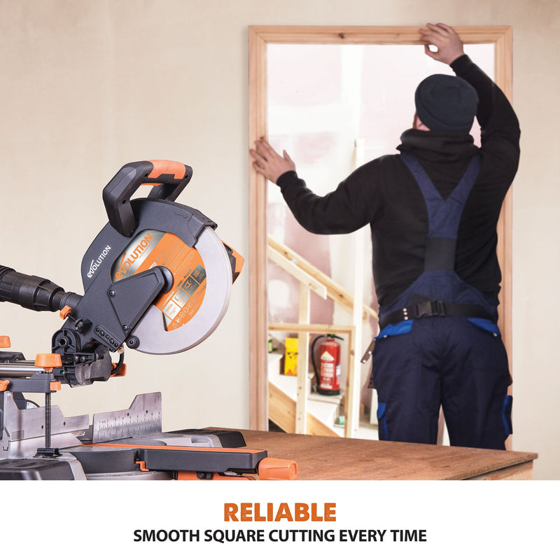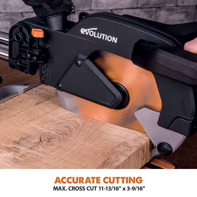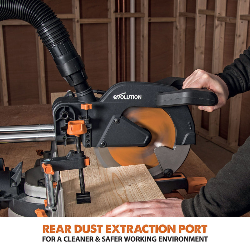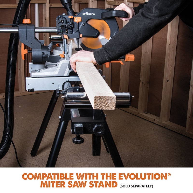 - Compatible with Evolution's Mitre Saw Stand, giving you full control to cut accurate repeated lengths on wide and long materials with ease.