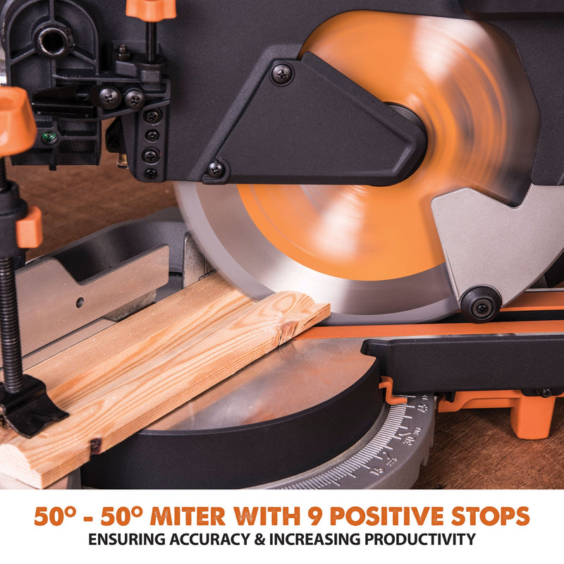 - Precision: 11-3/4" sliding, 0-45° bevel, 50° miter.