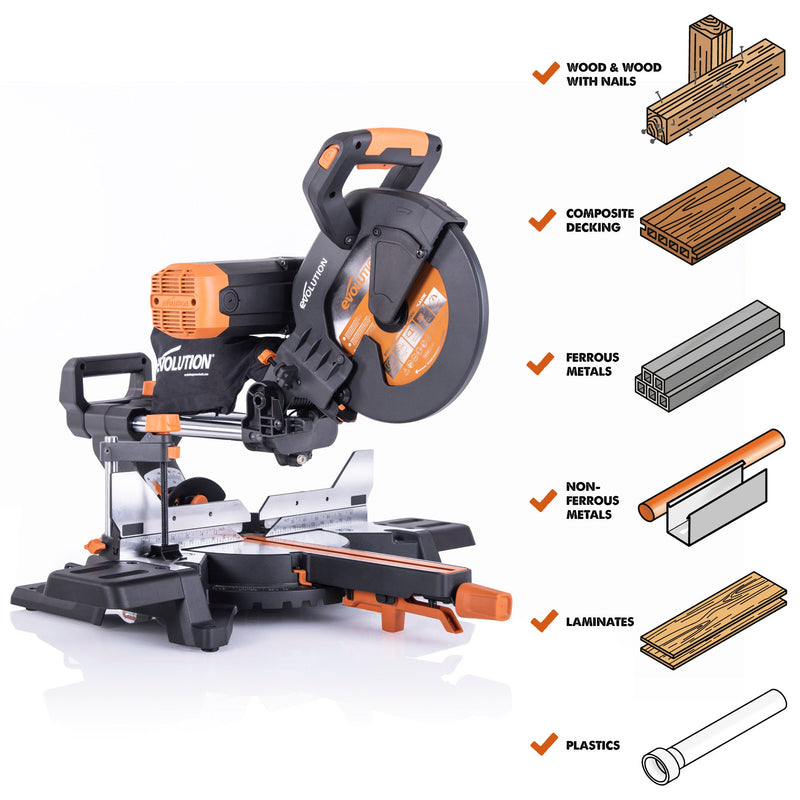 Evolution R255SMS-DB+: Dual Bevel Sliding Miter Saw With 10 in. Multi-Material Cutting Blade