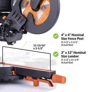 The biggest saw in the Evolution family of miter saws. An impressive 3-1/2 depth of cut and a 12-inch slide for big cross cuts in 4 x 4-inch fence posts, as well being able to cut through hardwoods, mild steel, aluminum, plastic and more with a single blade included with the machine. Complete with all the accessories required to deliver fast, accurate, hassle-free cutting.